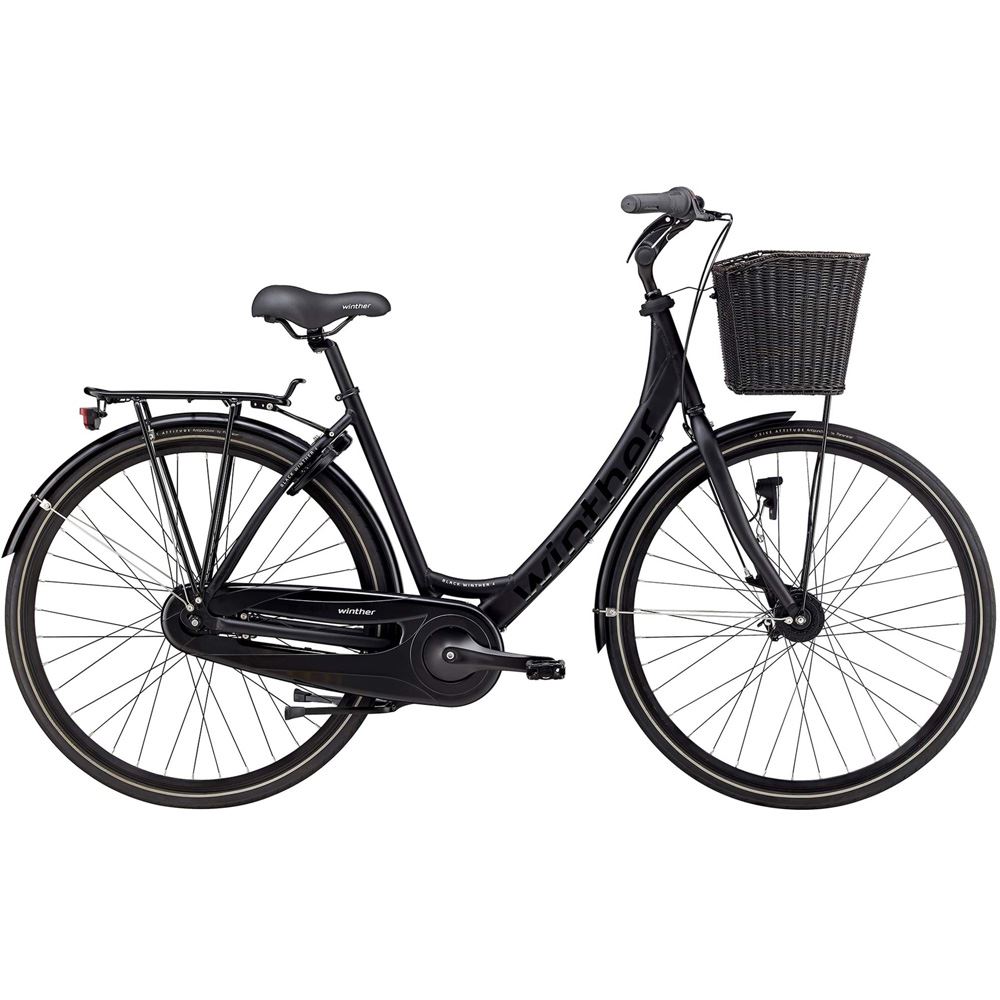 Winther damecykel med kurv og dynamonav. Winther 4 er en komplet damecykel med alt i udstyr. Den har en komfortabel kørestilling og nem påstigning. Styret kan justeret i både højde og vinkel uden brug af værktøj. Cyklen er udstyret med 7 gear og fodbremse samt rullebremse. Forhjulet har dynamonav, og cyklen har både forlygte og baglygte. Et solidt dobbelt støtteben sikrer, at cyklen står stabilt, når der er varer i kurven (kurv ikke incl.). Denne damecykel har desuden lukket kædekasse, godkendt lås og dæk med beskyttelse mod punkteringer. Winther 4 er en elegant damecykel i topkvalitet. Den kan bruges i al slags vejr til cykelturen til arbejde og indkøb, og den er let at vedligeholde.